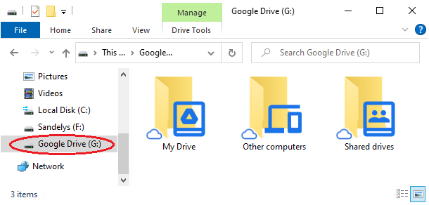 Parsisiuntus bei susiinstaliavus Google disko programą kompiuteryje – pirmą kartą paleidžiant – Jūsų paklaus ar tikrai pageidaujate pasiekti Google diske esančius failus per šį kompiuterį (tuomet atsidarančiame naršyklės lange turėsite duoti sutikimą). Teisingai viską atlikus – Jūsų kompiuteryje šalia sisteminio disko (dažniausiai žymimo raide „C:”) – atsiras papildomas Google diskas (dažniausiai žymimas raide „G:”).